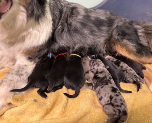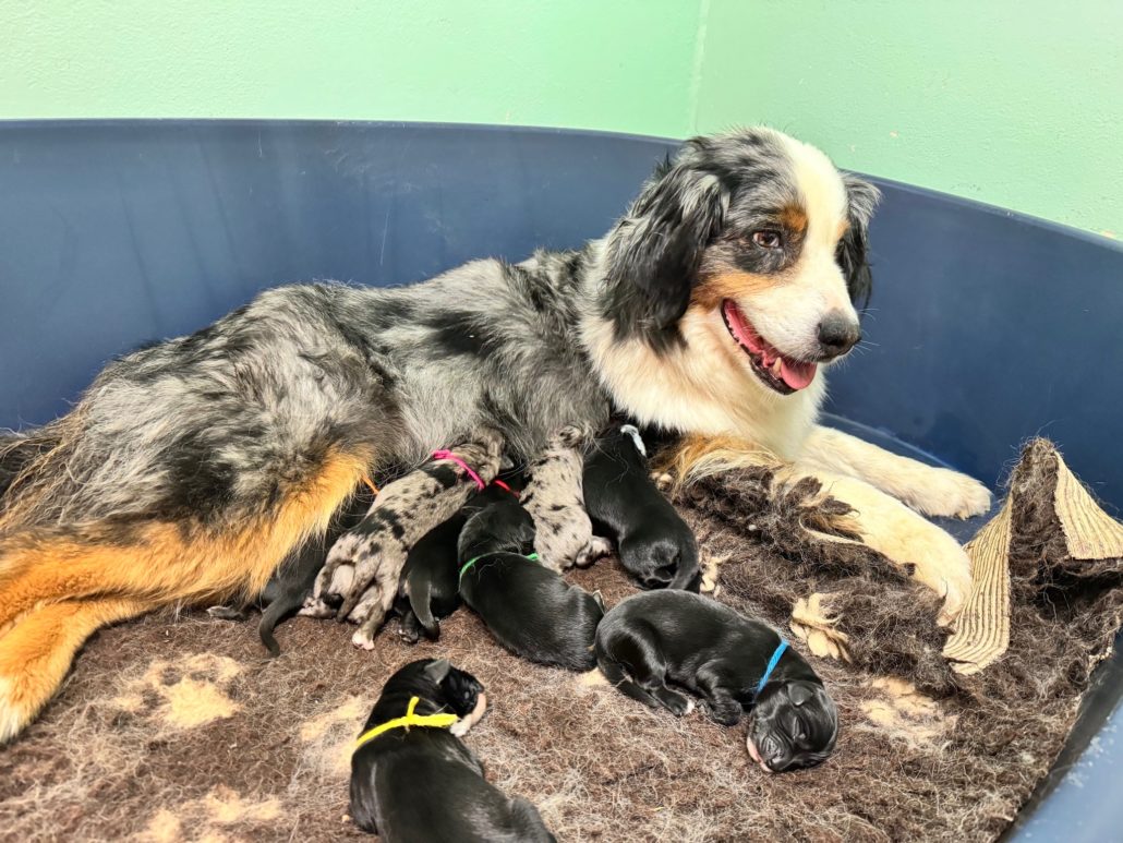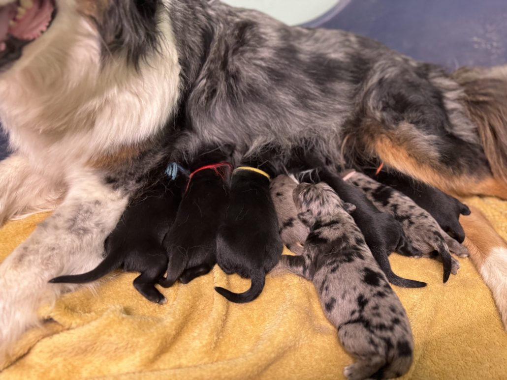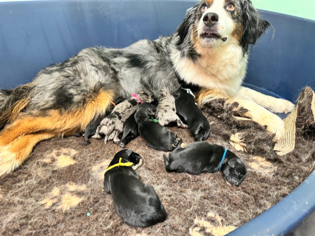 8 chiots en pleine forme sont nés, 4 femelles et 4 mâles.