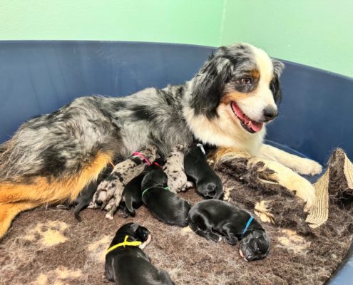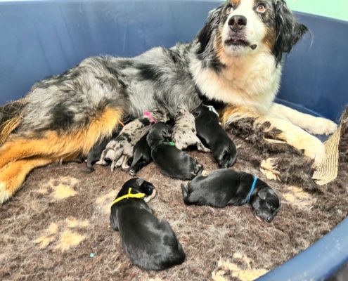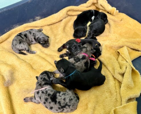 C’est la dernière portée de Jaïna, qui est ensuite attendue pour une heureuse retraite dans une famille aimante.