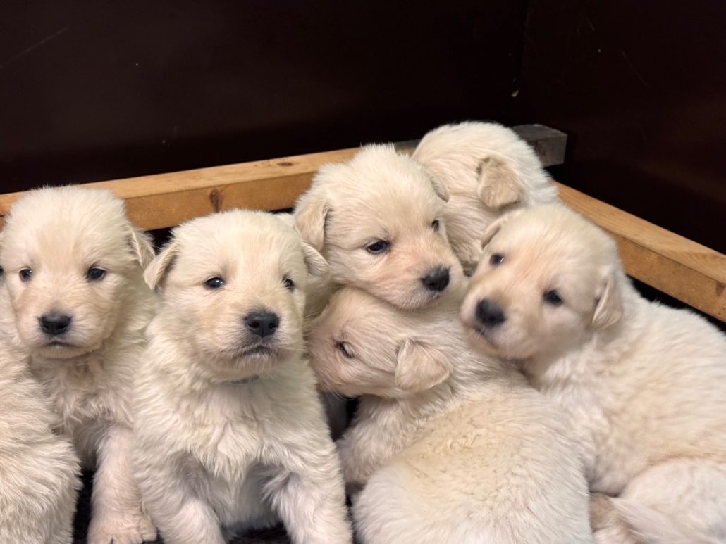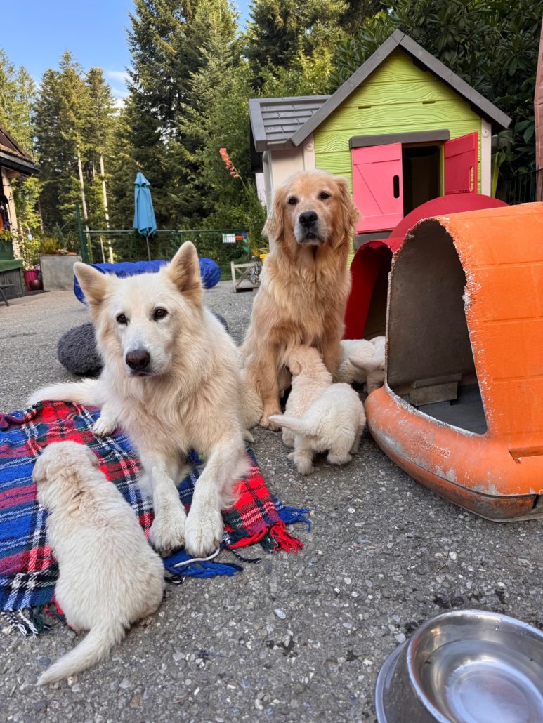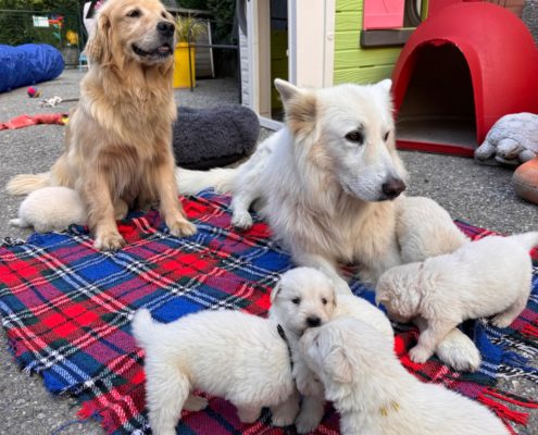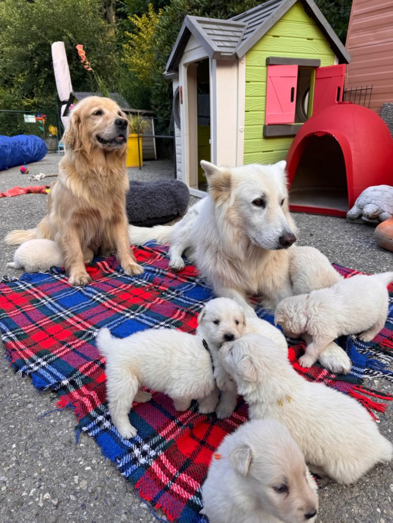 Malheureusement, après les saillies avec le mâle Golden Retriever qui lui était destiné, Tatoo a croisé le chemin de notre adorable mâle Berger Blanc Tyson….et ça a été le coup de foudre…8 superbes chiots sont nés .