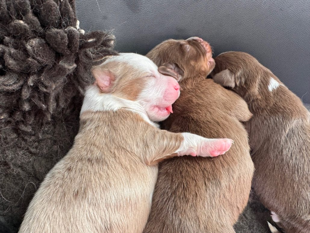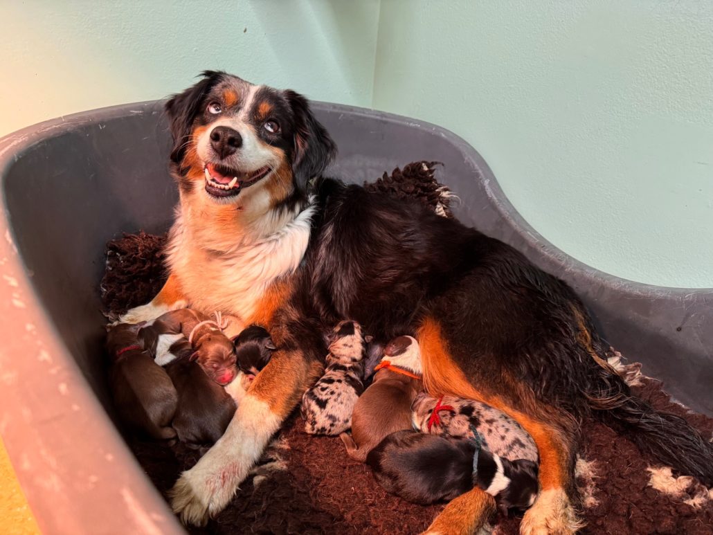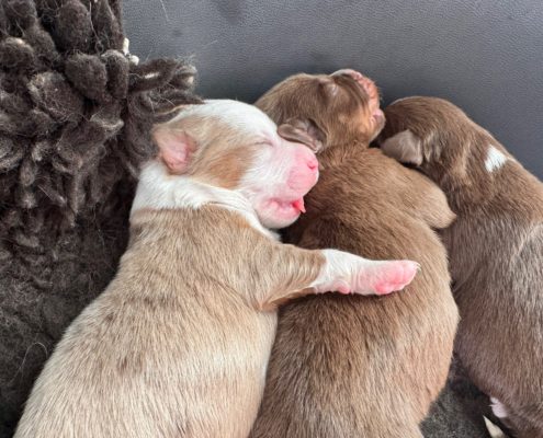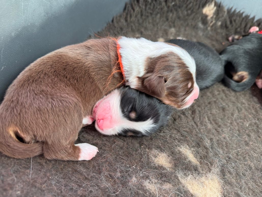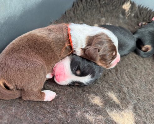 Pour sa dernière portée, Jewell nous a fait le cadeau d’une superbe portée arc-en-ciel. 9 chiots magnifiques, dont 4 rouge tricolores comme le papa.