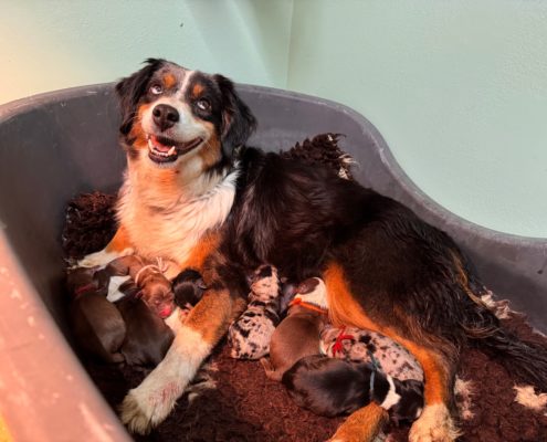 Il y a également 2 mâles noir tricolores, 1 mâle rouge merle, 1 mâle bleu merle, et une femelle bleu merle, qui restera à l’élevage.