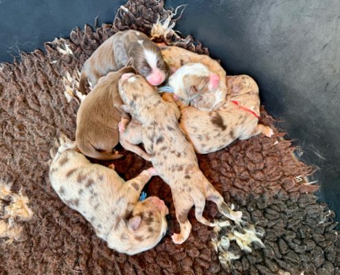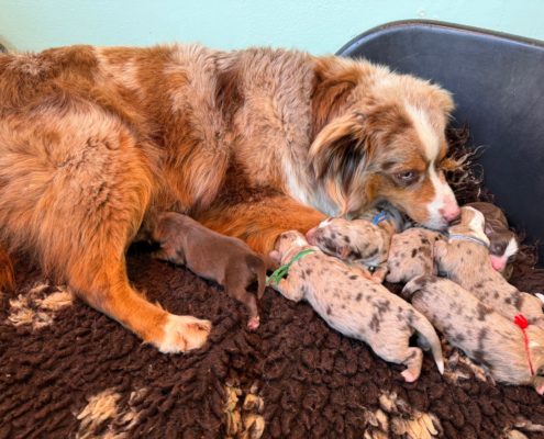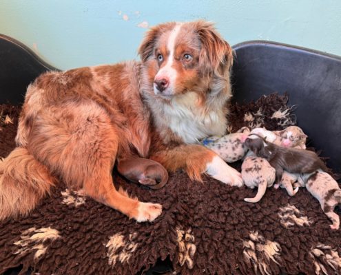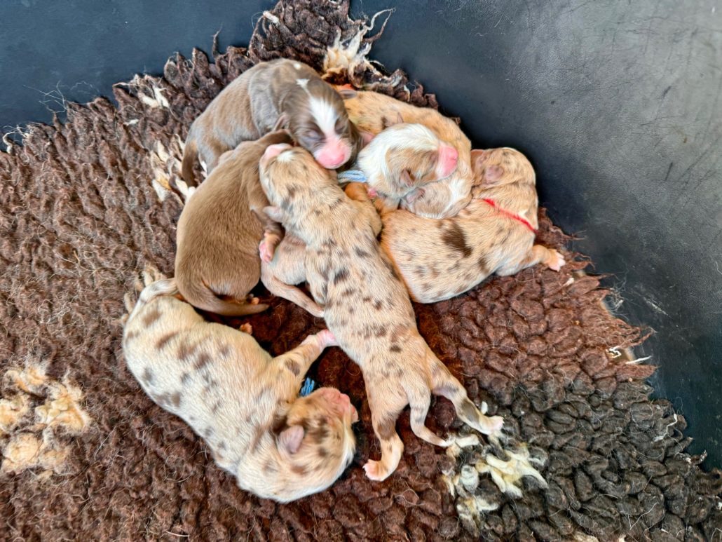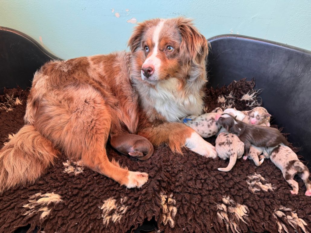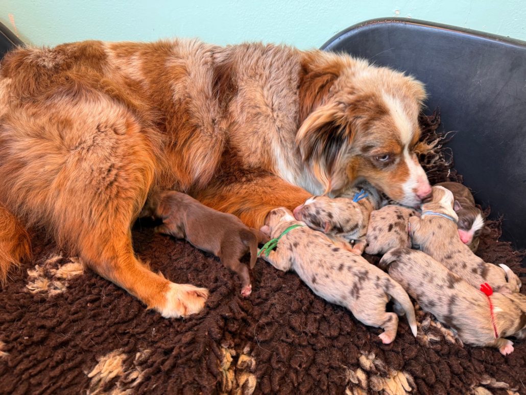 Loca a mis au monde 7 magnifiques chiots. 2 rouge tricolores comme le papa, et 5 rouge merles comme leur maman. Les chiots et la maman sont en pleine forme.
