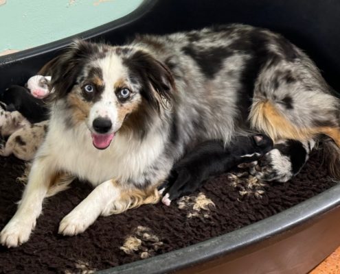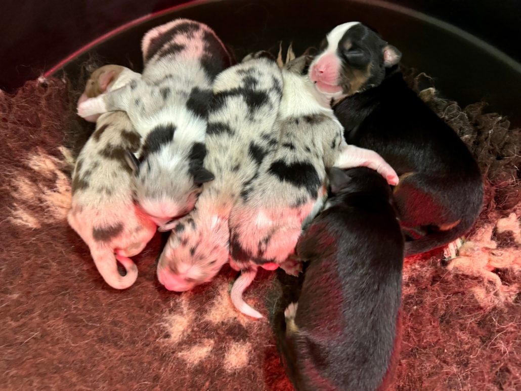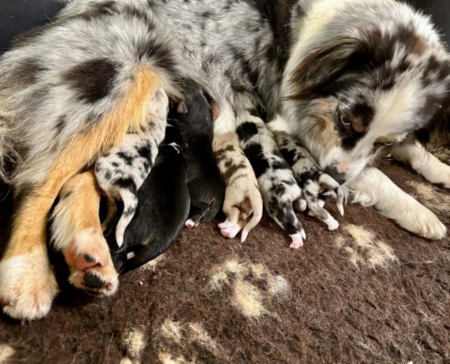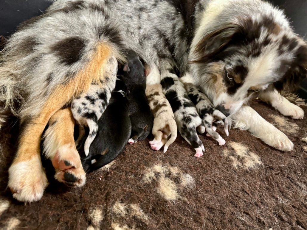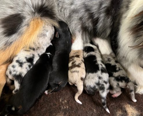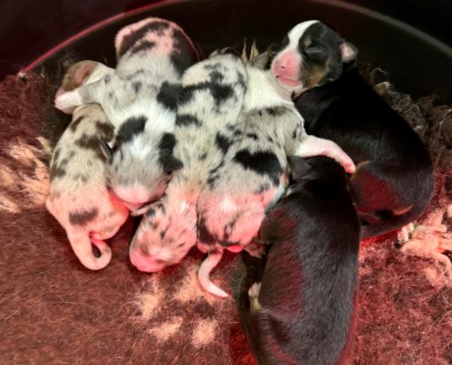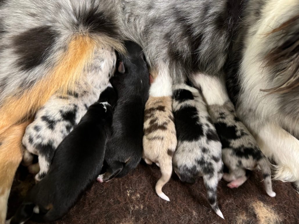 Il y a 2 mâles bleu merle, 2 femelles noires tricolores, 1 femelle bleu merle et 1 femelle rouge merle.