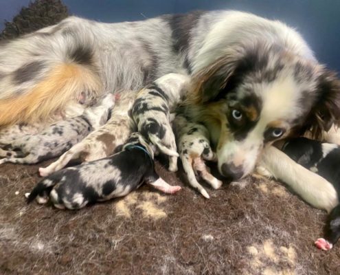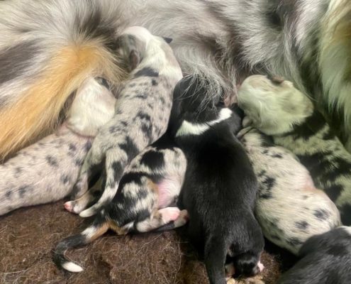 Miss Momo a 2,5 ans, et c’est sa première portée. Après un peu d’aide à la mise bas (pas trop sûre de ce qu’elle devait faire avec ces « trucs »qui sortaient de son ventre et qui gigotaient)…elle a très vote su s’en occuper à merveille.