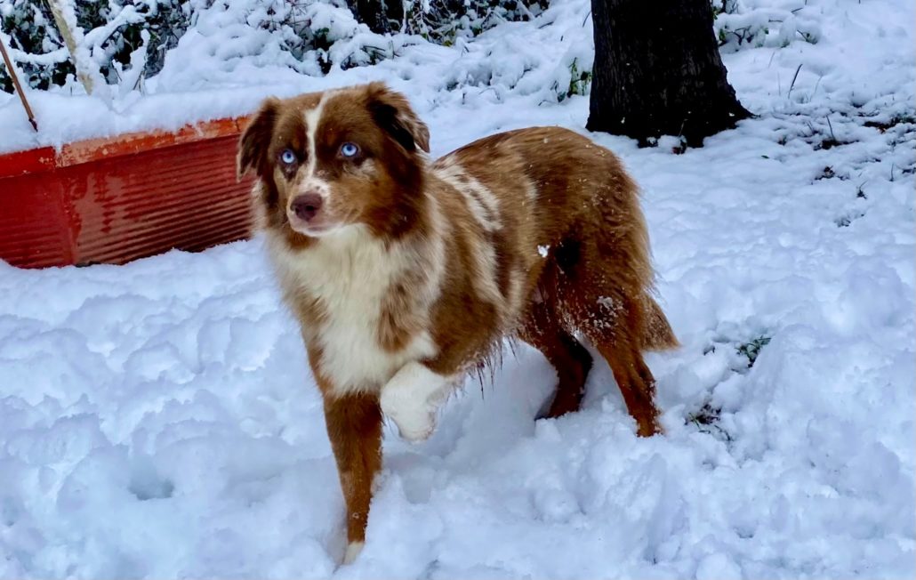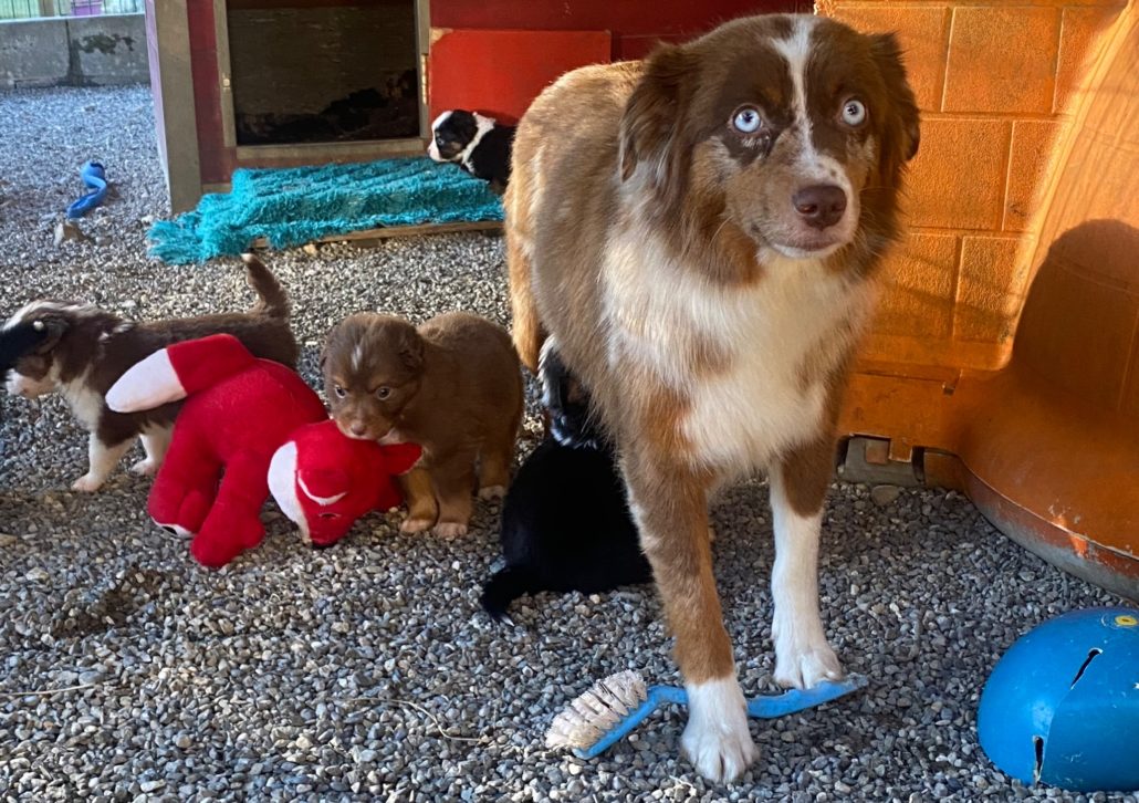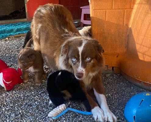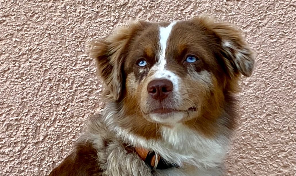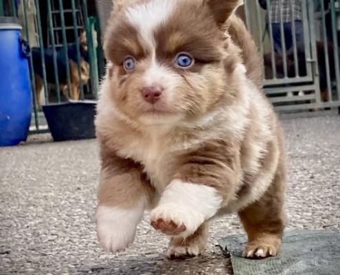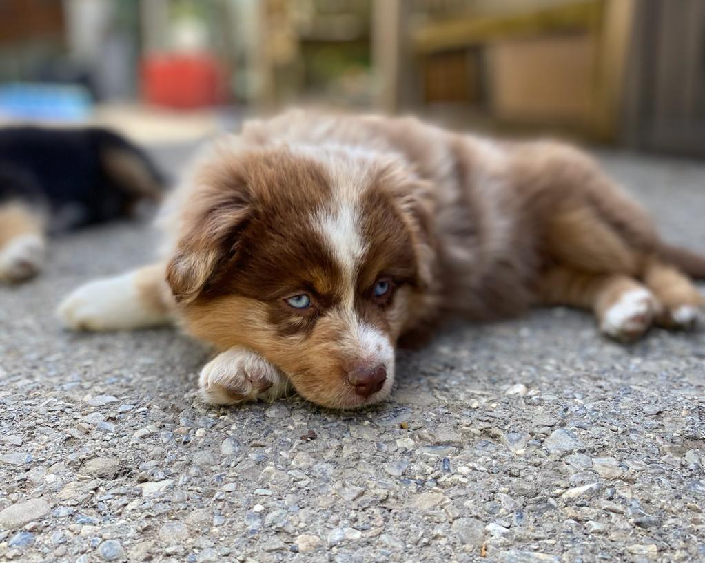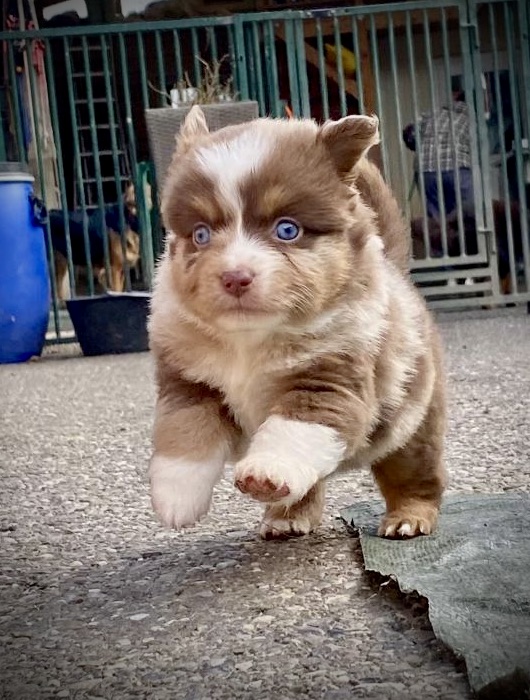 Oasis est un peu plus réservée que son grand frère Koboy, mais très douce et très câline. Ses yeux bleus ressortent magnifiquement sur sa robe rouge merle foncée.